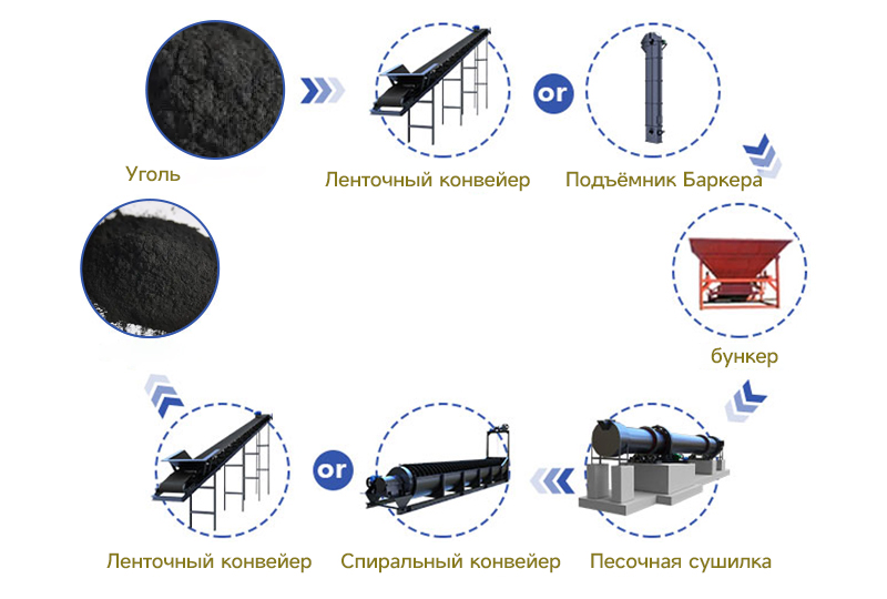 Уголь отправляется в бункер ленточным конвейером или ковшовым элеватором, а затем поступает в загрузочный конец через загрузочную трубу через загрузочную машину бункера. Материал добавляется с верхнего конца, а теплоноситель поступает с нижнего конца и находится в противоточном контакте с материалом. Когда влажный материал движется вперед в цилиндре, он напрямую или косвенно получает тепло от теплоносителя, так что влажный материал может быть высушен, а затем отправлен через ленточный или винтовой конвейер на разгрузочном конце. Кроме того, пылеуловители также могут использоваться для уменьшения пыли в системе сушки.